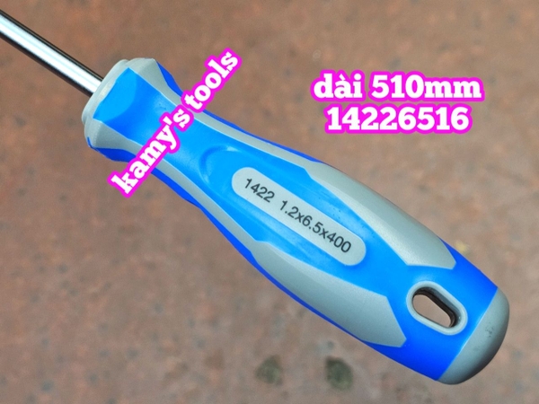 Đường kính phần đầu dẹp là 6.5mm, độ dày 1.2mm, phần thân dài 400mm tương đương 14 inch, Tua vít luôn cán toàn thân dài 510mm.