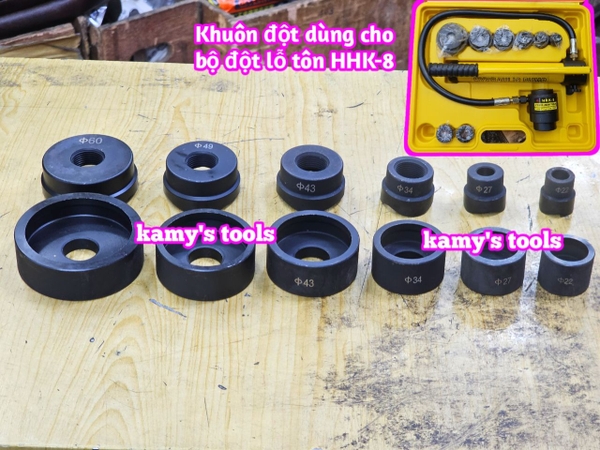 Hãy liên hệ với kamytools để biết thêm thông tin chi tiết sản phẩm khuôn đột lỗ tôn dùng cho bộ đột lỗ tôn thủy lực TLP HHK-8 size 22mm 27mm 34mm 43mm 49mm 60mm.