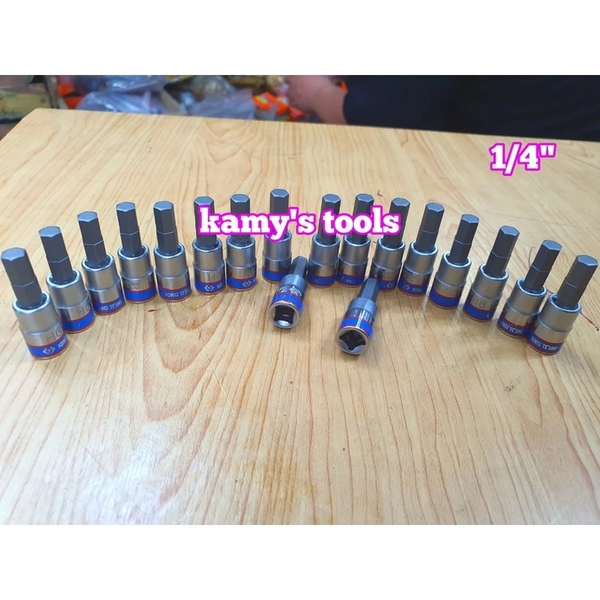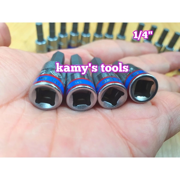 Đầu vuông: 1/4 inch sử dụng được với các cần tuýp có lỗ vuông 1/4" Đầu còn lại là lục giác các size thông dụng: H3, H4, H5, H6, H7, H8, H10.